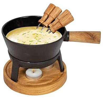 Recipientul pe patru picioare este din fonta. Dimensiunea este tocmai potrivită pentru brânză și se menține caldă cu o flacara ușoara. Furcile din fondu din oțel inoxidabil sunt sigure pentru alimente și se manuiesc extrem de confortabil datorită mânerelor din lemn de stejar. Puteți mixa aproape orice!
